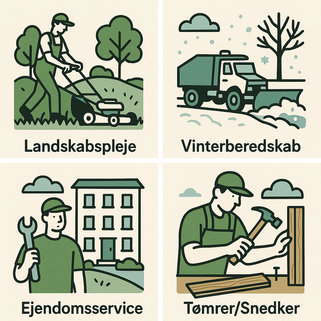 Vi tilbyder en række ydelser indenfor landskabspleje, vinterberedskab og ejendomsservice. Med en kombination af erfaring, fleksibilitet og høj servicegrad tilpasser vi vores arbejde til dine behov – uanset om det gælder faste aftaler eller akutte opgaver.
